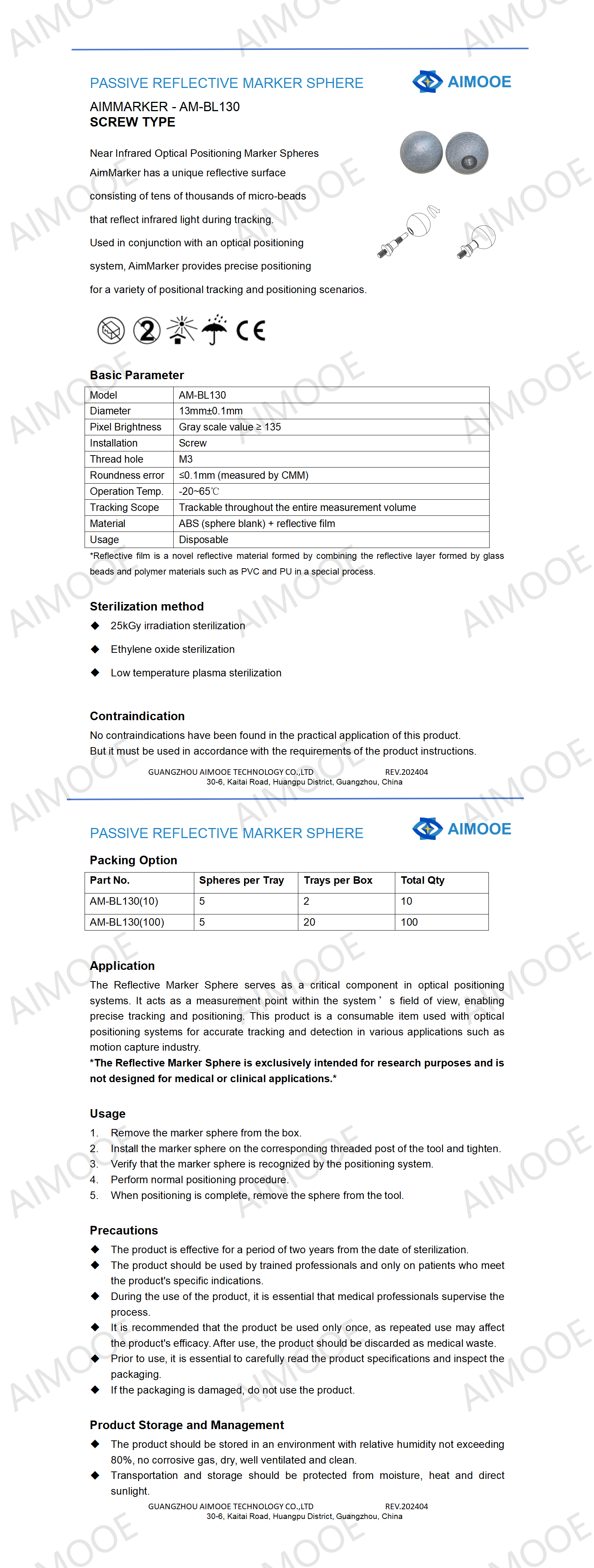 Aimooe reflective marker spheres are precision measurement components specifically designed for research purposes. These products have not been reviewed or approved by the FDA and are not intended for medical applications. They are not developed, tested, or manufactured in accordance with medical device standards or regulations. Aimooe assumes no liability for any use of these products outside their intended research purpose.
